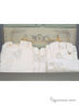 Шести предметный банный комплект на две персоны «Krizantem» имеет крупный рельеф махры и состоит из двух халатов (женский и мужской) и четырёх полотенец (50х90см(2шт), 70х140см(2шт)). Женскому халату изящный вид придаёт вышивка на вороте шёлковой нитью в виде цветка хризантемы, мужской халат дополнений не имеет. Полотенце с одной стороны по краю имеет вышивку шёлковой нитью и кружево из органзы, рисунок на кружеве- бутон розы/ромашка. Мягкость и лёгкость халатов и полотенец, в сочетании с гигроскопичностью, делают их привлекательными как для сильных мужчин, так и для представительниц прекрасного пола. 68х50х36 см.Халат: женский L(1шт), мужской XL(1шт), Полотенца: 50х90см(2шт), 70х140см(2шт)