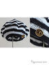 Симпатичный десткий берет в полоску, цвет темно-синий с белым. Сбоку модель украшена декоративным элементом.