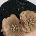 Мягкий берет из вязаного полотна с пайетками декорирован фактурными текстильными цветами со стразами и с бусинами в виде жемчужин. Подходит для романтичных и утонченных особ, привыкших одеваться с лоском.
