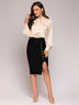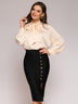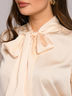 Блузка нежно-персикового цвета с бантом. За счет свободного кроя блуза подходит на размеры с 40 по 46.