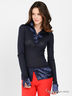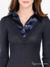 Детали: эффект двойки. Отложной воротник, застежка на две пуговицы, длинный прямой рукав с атласной манжетой, низ изделия оторочен атласной вставкой