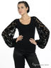 Блуза с округлым вырезом горловины привлекает к себе внимание за счет объемных прозрачных рукавов.