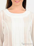 Детали: вырез горловины лодочка, застежка по спинке на пуговицах, длинные рукава с широкой завернутой манжетой на пуговицах, по плечу ткань присборена, с лицевой стороны оригинальная плиссировка ткани, застежка на молнии сбоку по шву.