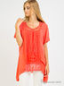 Легкая блуза имеет округлый вырез горловины и короткие рукава. Спереди изделие украшено кружевным узором. Низ ассиметричного кроя. Отличный вариант для создания повседневного романтичного образа.