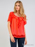 Блуза с короткими рукавами и округлым вырезом горловины. Модель свободного кроя выполнена из качественного материала привлекательной расцветки. Отличный вариант на каждый день. Спереди блуза декорирована рюшами.