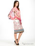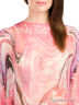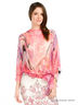 Шелковая блузка свободного кроя "летучая мышь", рукава 1/3, сужаются к локтю. Низ на резинке с вшитыми в боковые швы лентой-поясом. Декорирована ярким орнаментом из мягких пересекающихся линий.