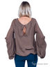 Блуза необычного покроя из тонкой ткани с длинными рукавами.