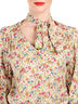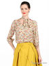 Детали: рукав 3/4 с манжетой; ворот-стойка переходит в декоративные ленты, которые завязываются спереди; оригинальный принт