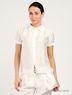 Детали: рубашечный воротник, застежка на пуговицы, короткие рукава с манжетами на пуговицах, на спинке кокетка и односторонние складки