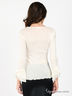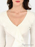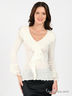 Детали: v-образный вырез горловины и длинный прямой рукав декорированы воланами, низ изделия обработан оверлоком
