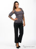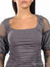 Детали: круглый вырез; рукава 3/4 декорированы тонкой сетчатой тканью; изделие декорировано выточками со сборками; по бокам вставлена резинка