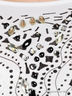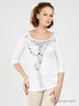 Детали: вырез лодочка горловины, рукава 3/4, полочка с принтом декорирована крупными стразами.
