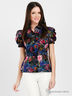 Стильная блуза из тонкого, мягкого батиста с оригинальным ярким принтом. Стояче-отложной ворот. Застежка на планку с пуговицами. Короткие рукава с манжетами декорированы односторонними складками. Разрезы в боковых швах. Талия подчеркивается пояском плотной резинке. Отличный вариант на каждый день!