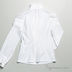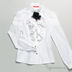 Детали: ворот-стойка с оборкой, застежка на пуговицы, манжеты на пуговице, складки на рукавах, планка-застежка оформлена оборками, крупная брошь