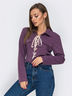 Практичная кофта прямого кроя с отложным воротником. На полочке изделие дополнено декоративными клапанами и шнуровкой.
