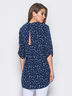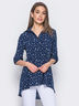 Стильная блузка с удлинением по спинке, отложным воротником и рукавами 3/4 со шлевками. Изделие дополнено вырезом на спинке. Застегивается на пуговицы на полочке.
