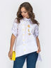 Хлопковая блузка свободного кроя с асимметричным низом. Изделие дополнено нашивкой «банан». Застегивается на пуговицу сзади. На модели представлен 44 размер: * длина по спинке – 80 см; * длина по полочке – 64 см; * длина рукава (от горловины) – 58 см;