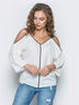 Оригинальная блузка на толстых бретелях с V-образным вырезом и открытыми плечами. Особый вид изделию придает тесьма по горловине и рукавах. Без застежек.