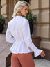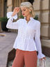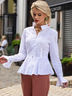 Стильная блузка приталенного кроя с баской. Модель с воротником-стойкой и длинным рукавом, дополненным оборкой. Застегивается на пуговицы и навесные петли. Изделие без подкладки. Прекрасный вариант для летнего образа в деловом стиле.
