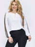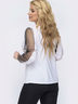 Однотонная блузка с вырезом «капелька». Длинные рукава дополнены вставками из мягкой сетки в горошек.