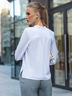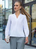 Лаконичная белая блузка прямого кроя с узкой рюшей вдоль горловины. По бокам небольшие разрезы. Пояс в комплект не входит. Отлично впишется в деловой dress-code.