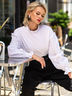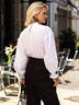 Белая блузка прямого кроя с воротником-стойкой, дополненным узким кружевом. Объемные рукава из прошвы с эластичной вставкой на манжете. Застегивается сзади на пуговицу.