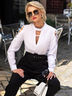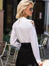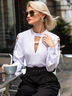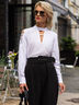 Элегантная блузка прямого кроя с воротником-стойкой. Изюминка изделия – фигурные вырезы на горловине и рукавах. Застегивается сзади на пуговицы.