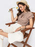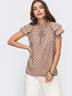 Легкая блузка прямого кроя из софта в горох с рукавом-крылышко. Короткий воротник-стойка с узкими завязками у горловины. По бокам предусмотрены небольшие разрезы.