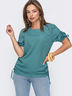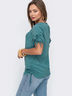 Блузка прямого кроя из легкой костюмной ткани цвета петроль. На рукавах и по бокам изделие дополнено кулисками. На спинке разрез и застёжка на пуговицу.