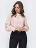 Блузка свободного кроя из легкой приятной к телу ткани с небольшими разрезами по бокам. Модель с присборкой по горловине, воротником стойкой, втачным рукавом на манжете, застегивающимся на пуговицы.