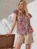 Элегантная блузка из воздушного шифона в красивый цветочный принт. Модель прямого кроя с рукавом-крылышко. Треугольный вырез горловины, дополнен широкими завязками, преходящими в бант.