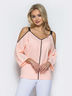 Оригинальная блузка на толстых бретелях с V-образным вырезом и открытыми плечами. Особый вид изделию придает тесьма по горловине и рукавах. Без застежек.
