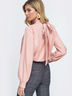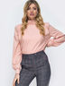 Однотонная блузка свободного кроя с воротником-стойкой, переходящим в бант на спинке.