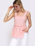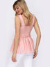 Однотонная блузка из софта с баской. Изделие на широких бретелях с отделкой маленькими помпонами. В центральной части спинки вафельная сборка.