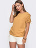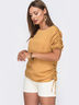 Однотонная блузка прямого кроя из легкой костюмной ткани. На рукавах и по бокам изделие дополнено кулисками. На спинке разрез и застёжка на пуговицу.