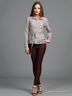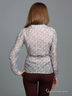 Блуза прилегающего силуэта, с отложным воротником на цельновыкроенной стойке. Застежка на пуговицы начинается от линии груди. В комплект входит узкий длинный поясок, который можно завязывать на талии. Модель выполнена из нежнейшего шелковистого батиста.