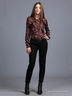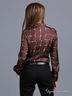 Шелковая блузка с застежкой спереди. Длинный рукав на манжете. Полуприлегающий силуэт. Воротник мягкая стойка, в который вставлен декоративный шнурок, завязывающийся на бант. Декоративный волан по планке спереди.