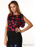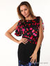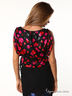 Легкая блуза с короткими рукавами, круглый вырез. Блуза декорирована сеточкой с разноцветной аппликацией, с отрезным низом на шнурке. Сзади на пуговице.