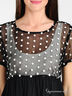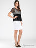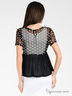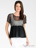 Комбинированная кофта с круглым вырезом, короткими рукавами. Кофта украшена контрастным принтом в горох и широким воланом.