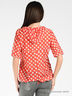 Легкая блуза с коротким рукавом, накладными карманами, застежка на трех пуговицах, капюшоном на кулиске и контрастным цветочным принтом. По подолу так же завязка на кулиске.