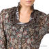 Приталенная шифоновая блуза с цветочным принтом на пуговицах. Блуза имеет длинные рукава и оригинальный воротниик-стойку. Вырез горловины, воротник и манжеты декорированы атласной лентой и рюшами, что придает блузе романтический стиль.
