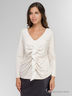 Блуза с длинными рукавами и глубоким вырезом декольте. Изделие выполнено из качественного материала привлекательной расцветки. Спереди модель декорирована рюшами. Отличный вариант на каждый день.