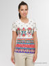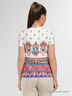 Легкая блуза украшенная ярким контрастным принтом. Модель имеет округлый вырез горловины, рукава короткие. Практичный и выгодный вариант на каждый день.