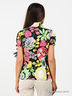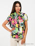 Детали: отложной воротник стойка, застежка на планку с пуговицами, края коротких рукавов присборены, вытачки для лучшей посадки по фигуре, яркий цветочный принт.