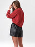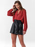Блузка прямого силуэта из крепа. Детали: кокетка по переду и спинке, защипы по линии кокетки переда и спинки, отложной воротник, длинный втачной рукав с манжетой с застежкой на петли-пуговицы. Застежка по переду на петли-пуговицы.