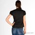 Приталенная блуза с короткими рукавами-"фонарики" и воротником-стойкой, переходящим в хлястики, которые завязываются в бант. Застежка на пуговицах. На груди блуза декорирована рюшами.