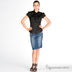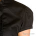 Приталенная блуза с короткими рукавами-"фонарики" и воротником-стойкой, переходящим в хлястики, которые завязываются в бант. Застежка на пуговицах. На груди блуза декорирована рюшами.