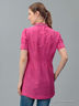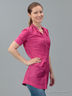 Великолепная удлиненная рубашка с короткими рукавами. Модель имеет красиво оформленный воротник-стойку. Прекрасный вариант для женского гардероба.