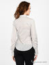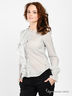 Изящная блуза из тонкой, гладкой, полупрозрачной ткани в полоску. Ворот-стойка. Застежка на планку с пуговицами. Длинные рукава с завязками в кулиске на манжетах. Полочка декорирована крупными вертикальным воланами.