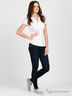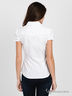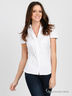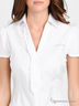 Детали: рубашечный ворот, V-образный вырез горловины, короткий рукав, застежка на пуговицы, вытачки, вырез горловины украшен оборками, полочка декорирована стразами